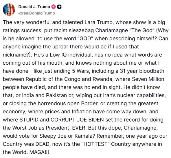 🔥 President Trump sharply attacked radio host Charlamagne Tha God on Truth Social after Charlamagne appeared on Lara Trump’s Fox News show, where he suggested the Epstein scandal might lead "traditional conservatives" to reclaim the Republican Party from the MAGA movement. Trump called Charlamagne a "low IQ individual" and a "racist sleazebag," questioned why he was allowed to use "God" in his name, and said he knew nothing about Trump or his accomplishments. The post followed Charlamagne’s remarks that the Epstein files have energized the GOP base and may be driving a political shift within the party away from Trump’s influence.