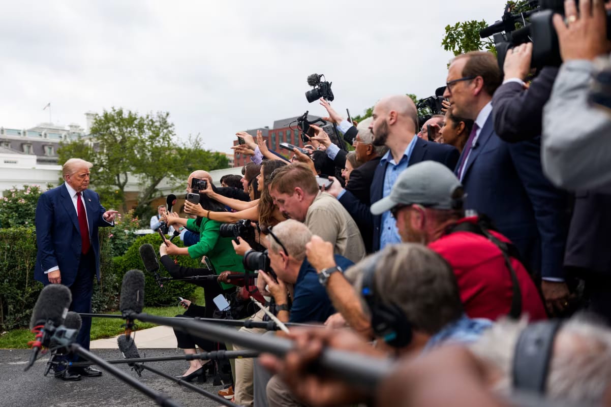 President Trump speaks to members of the media on the South Lawn of the White House.