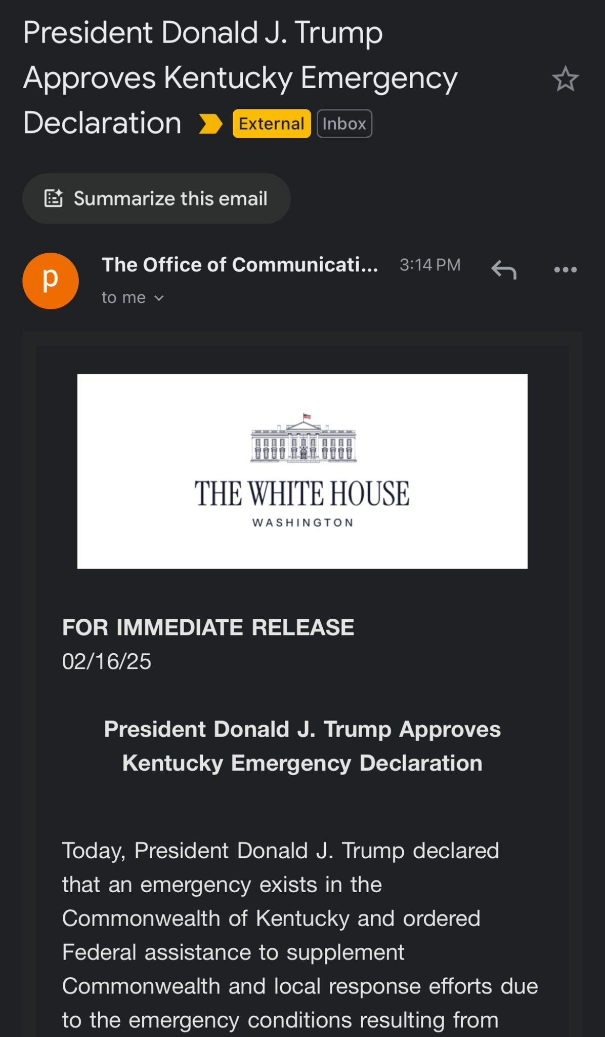 DISASTER RELIEF: President Trump declared an emergency in Kentucky due to severe storms, flooding, and landslides, authorizing federal aid to assist local response efforts. FEMA will coordinate disaster relief, providing emergency protective measures with 75% federal funding to mitigate the crisis. Jeremy Slinker has been appointed to lead federal recovery operations in the affected areas.