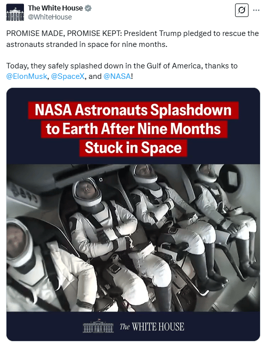 They, along with astronaut Nick Hague and cosmonaut Aleksandr Gorbunov, were safely brought back aboard SpaceX’s Crew Dragon, which splashed down off the Florida coast on March 18, 2025.