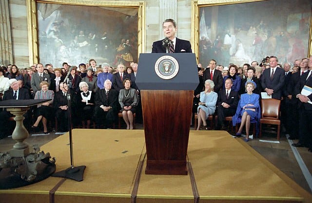 Ronald Reagan’s second inauguration took place on January 20, 1985, in a private ceremony at the White House, with Chief Justice Warren E. Burger administering the oath. The next day’s public inauguration faced historically cold temperatures, so the formal ceremony moved indoors to the Capitol Rotunda.