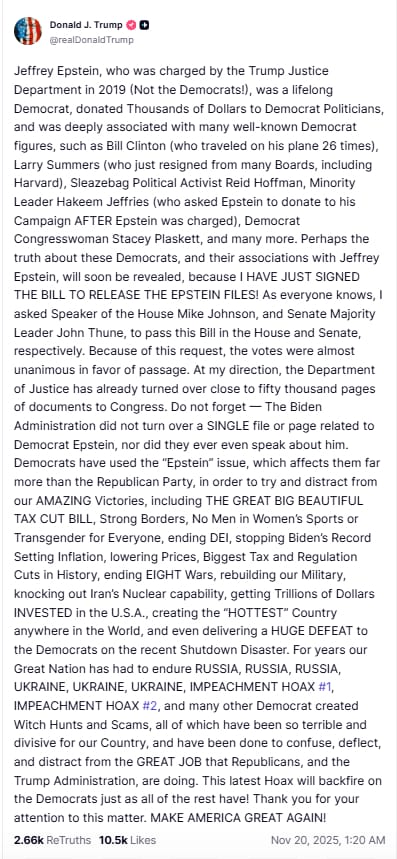 President Trump announced he signed the Epstein Files disclosure bill and immediately targeted Democrats for their relationships with convicted sex offender Jeffrey Epstein. Trump wrote on Truth Social that Epstein was a lifelong Democrat who gave thousands of dollars to Democrat politicians and maintained close relationships with prominent party figures. He pointed to former President Bill Clinton, who traveled on Epstein's plane 26 times, former Treasury Secretary Larry Summers, billionaire Democrat megadonor Reid Hoffman, House Minority Leader Hakeem Jeffries, and Delegate Stacey Plaskett.