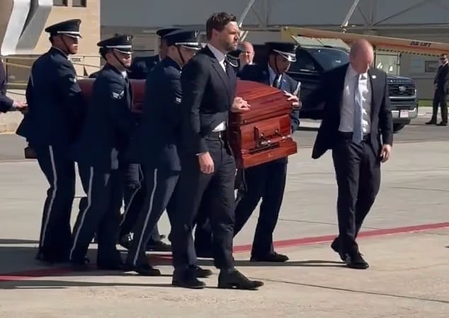 Vice President JD Vance stood front and center as he and members of the National Guard carried Charlie Kirk's coffin to Air Force Two on Thursday.