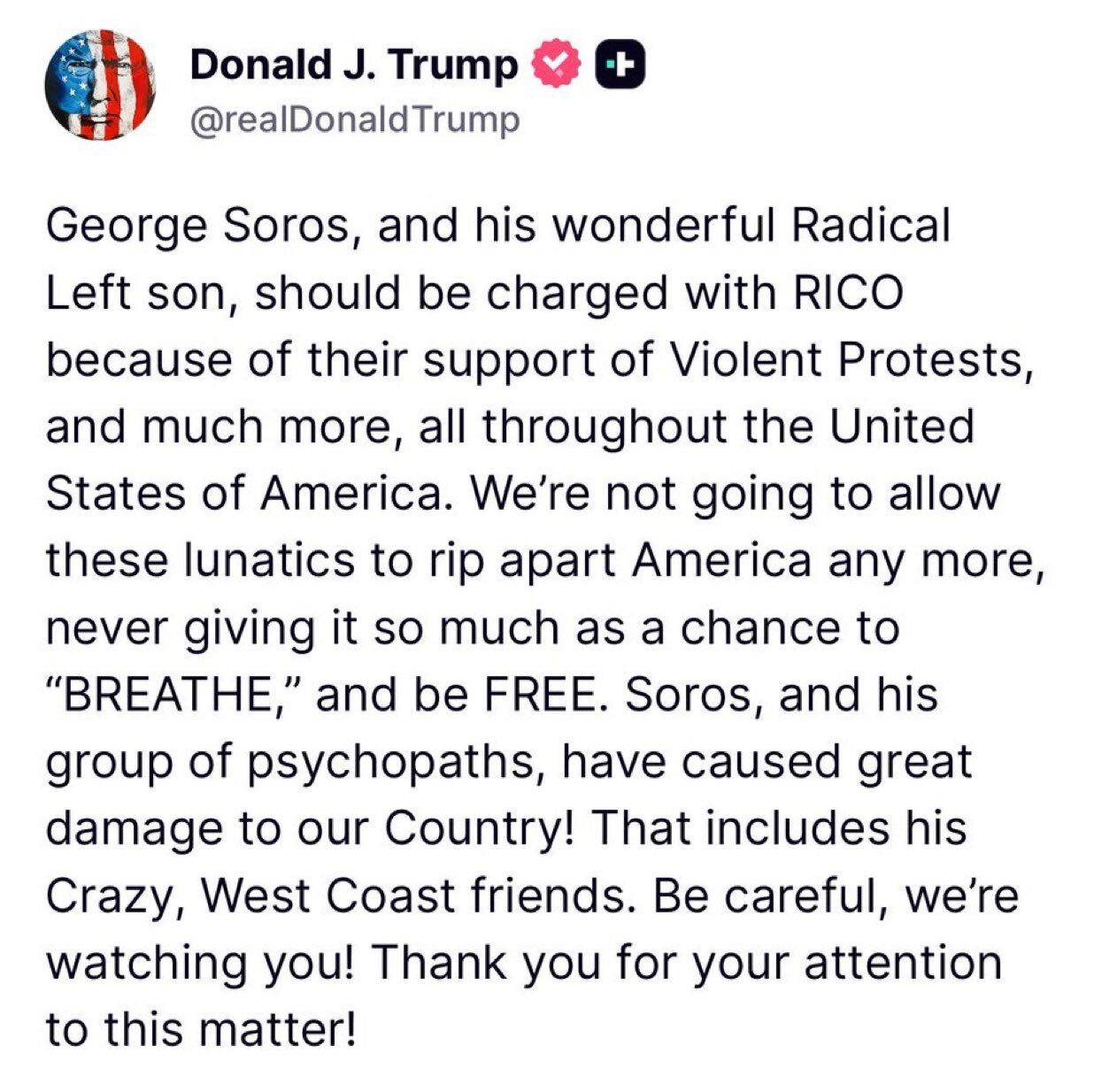 On Truth Social, Trump blasted the billionaire financier for bankrolling violent protests and fueling the radical Left’s agenda across America. He warned Soros and his “group of psychopaths” that their days of hiding behind money and influence may be numbered.