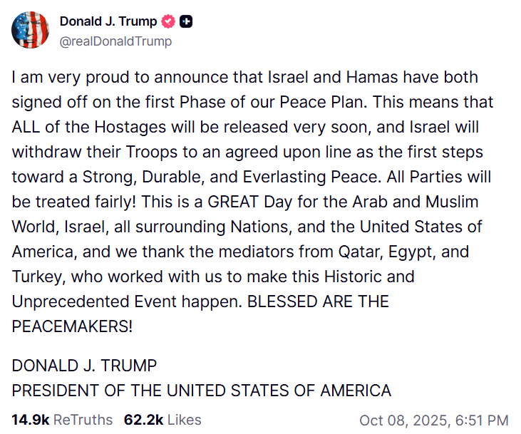 President Trump announced that Israel and Hamas have both signed off on the first phase of his peace plan, ending nearly two years of conflict that began after the October 7, 2023 attacks. All hostages will be released very soon, with living hostages expected to be freed within 72 hours of the agreement, while Israel will withdraw troops to an agreed-upon line as initial steps toward lasting peace.