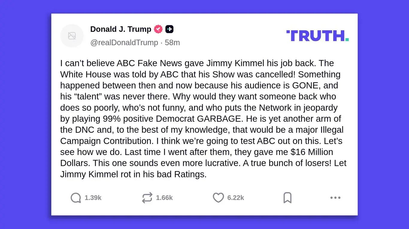 President Trump slammed ABC and Jimmy Kimmel in a Truth Social post, expressing disbelief that the network gave Kimmel his job back after the White House was told his show was canceled. Trump criticized Kimmel's controversial comments about reactions to Charlie Kirk's assassination, which triggered his suspension from ABC, though Disney executives later reinstated the show with statements about sensitivity. Major affiliates including Nexstar and Sinclair announced they would not air Kimmel's program unless their demands were met, with Sinclair specifically calling for a direct apology to the Kirk family and a meaningful donation. Trump accused Kimmel of putting the network in jeopardy by playing "99% positive Democrat GARBAGE" and suggested ABC's support amounted to "a major illegal campaign contribution" to Democrats. The president referenced a previous legal victory, saying "Last time I went after them, they gave me $16 million," and concluded by telling ABC to "Let Jimmy Kimmel rot in his bad ratings."