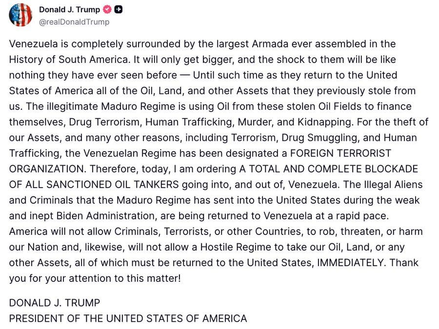 Trump dropped the hammer on Venezuela this week with two unprecedented moves that represent the most aggressive US posture toward the Maduro government in years. The president designated the Venezuelan regime as a foreign terrorist organization and ordered a total blockade of all sanctioned oil tankers entering or leaving the country, accusing Maduro of using stolen US assets to finance terrorism, drug trafficking, human trafficking, murder and kidnapping. Trump claimed that Venezuela is now "completely surrounded by the largest Armada ever assembled in the History of South America" and warned that the military presence will only grow until Maduro returns oil fields, land and other assets that Trump says were stolen from the United States.