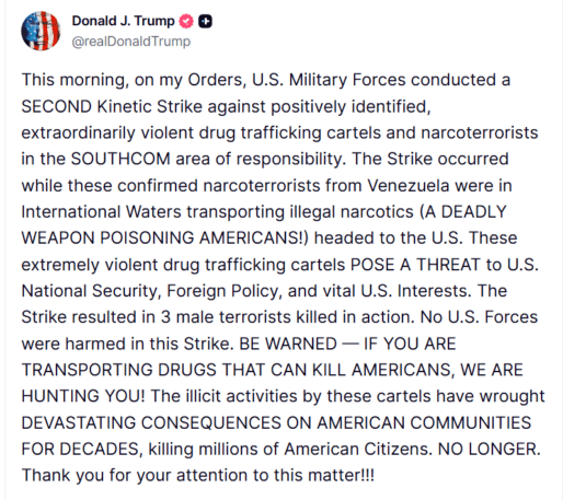 🪖 President Trump announced the U.S. military carried out a second kinetic strike in international waters against Venezuelan drug-trafficking cartels in the SOUTHCOM area while suspects were transporting illegal narcotics headed to the U.S. The strike killed three male terrorists and resulted in no U.S. casualties. This action follows a Sept. 2 strike on a suspected Tren de Aragua drug boat in the southern Caribbean that left 11 suspected narcoterrorists dead.