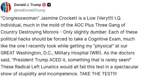 🧠 President Trump launched a renewed attack on Representative Jasmine Crockett, calling her a "Low (Very!!!) I.Q. Individual" and demanding she take a cognitive test similar to one he recently completed at a Washington D.C. military hospital, where doctors said he "ACED it, something that is rarely seen." The escalating feud centers around Crockett's accusations that Trump is pushing a "white supremacy agenda" and "diluting the voices of people of color" through redistricting efforts, while she has dubbed him a "Temu dictator" and called him a "piece of s---" during a progressive rally in Phoenix. Crockett has responded to Trump's attacks by questioning his own intelligence and citing his "most incompetent Cabinet in the history of this country," while defending her credentials and stating she has "the degrees, the credentials, and the receipts."