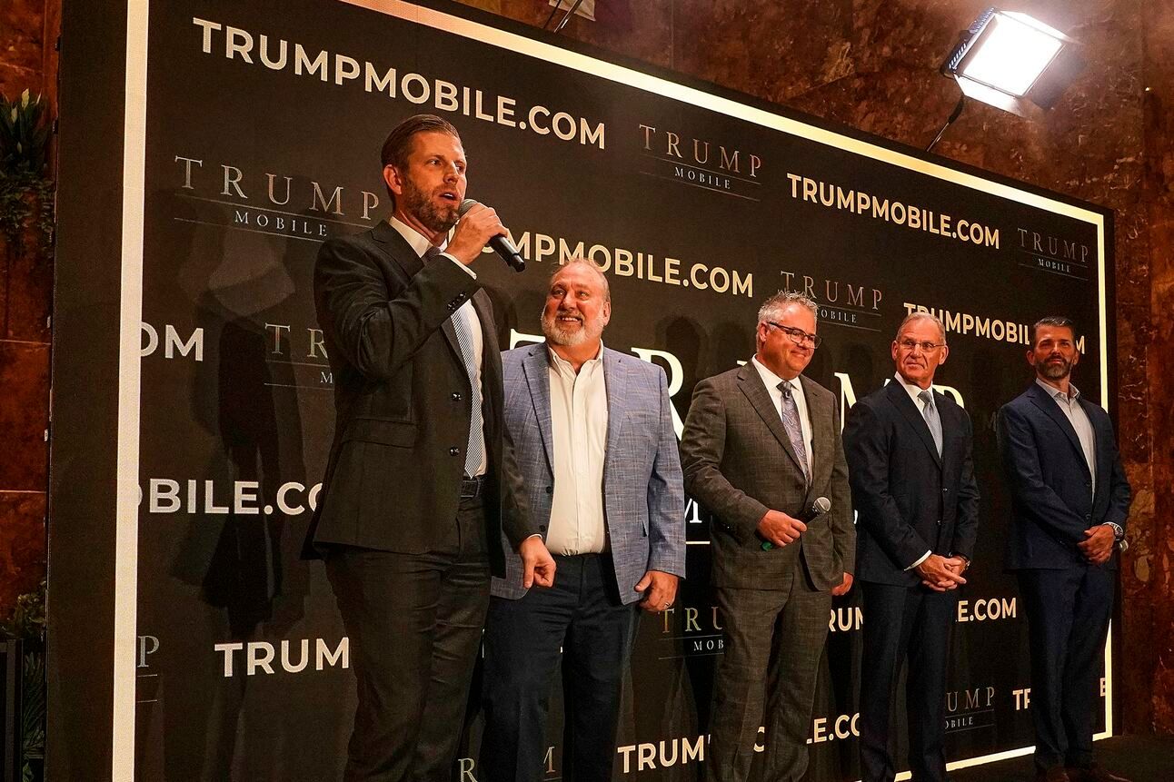Eric Trump, Don Hendrickson, Eric Thomas, Patrick O'Brien and Donald Trump Jr, participate in the announcement of Trump Mobile, in New York's Trump Tower.