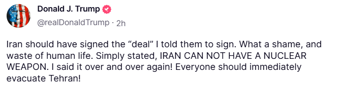As Israel pounds Iranian targets, Trump made clear: Iran canāt have nukes. Period.