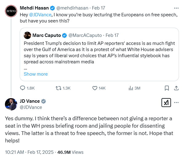 British journalist, Mehdi Hasan, attempted to challenge Vance’s stance, pointing out that the Trump administration restricted an AP reporter’s White House access over coverage of the “Gulf of America”.