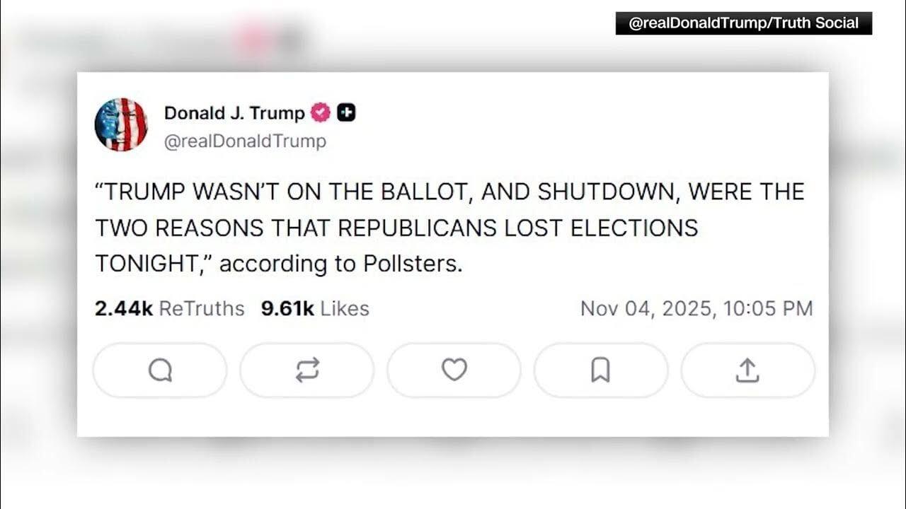 Trump stated that pollsters believe the reasons for Republican losses in New Jersey and Virginia were that he was not leading the ticket as well as the government shutdown, writing on Truth Social that "'TRUMP WASN'T ON THE BALLOT, AND SHUTDOWN, WERE THE TWO REASONS THAT REPUBLICANS LOST ELECTIONS TONIGHT,' according to Pollsters."