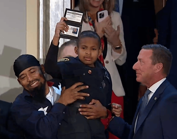 🚨 President Trump honored 13-year-old DJ Daniel, a brain cancer survivor who dreams of becoming a police officer, by making him an honorary Secret Service agent. Daniel, shocked by the announcement, proudly held up his certificate as the crowd erupted in applause and cheers. In a rare moment of unity, Democratic Rep. Laura Gillen stood and applauded in support.